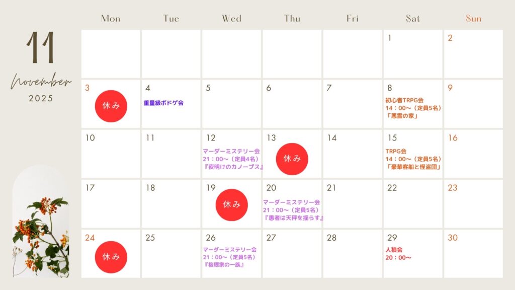 - 貴重品及び持参されたボードゲームの管理はお客様自身でお願いいたします。