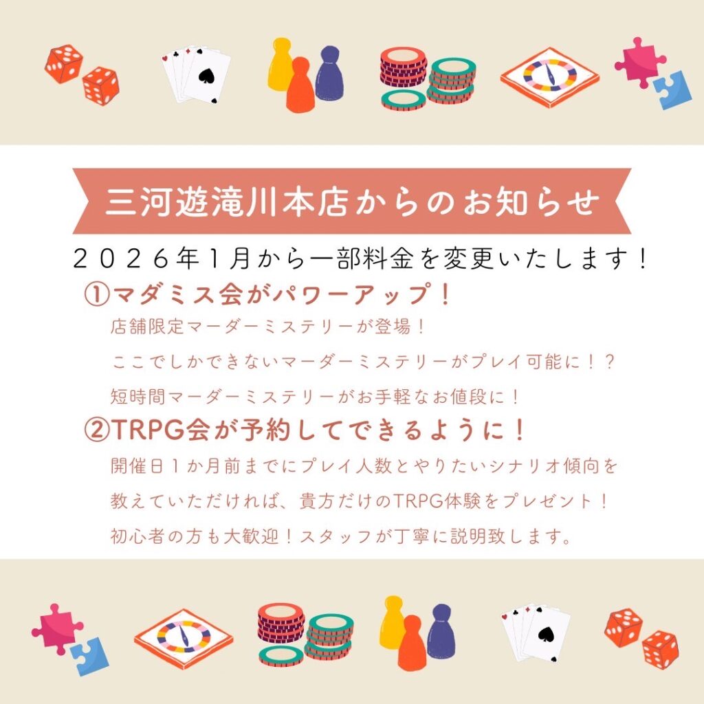 - 貴重品及び持参されたボードゲームの管理はお客様自身でお願いいたします。
